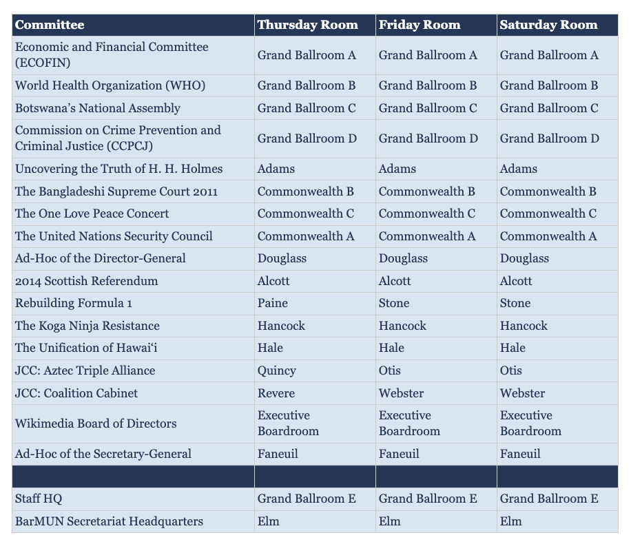This form includes everything delegates will need to know for BarMUN weekend, including committee locations, rules of procedure, conference regulations, travel information, and more.